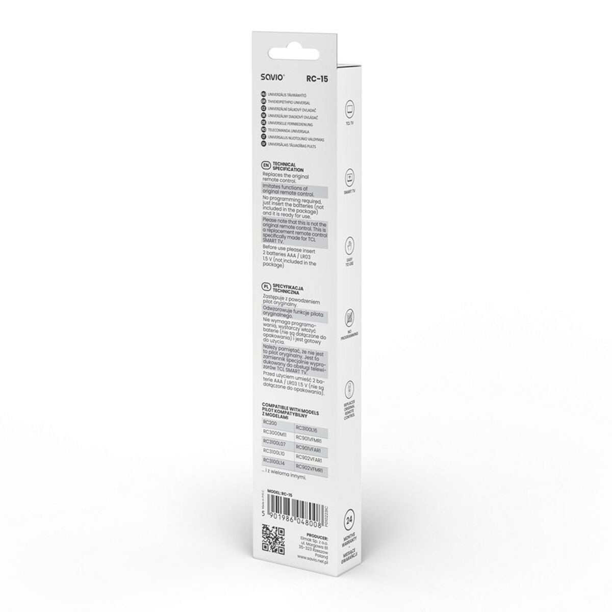 The Savio universal remote control RC-15 is a device designed to provide comfortable and versatile control over a wide range of electronic devices, especially TVs and multimedia equipment. It features a practical design in black with multicolored details that facilitate intuitive function identification, enhancing the user experience in daily use. It is characterized by its universal compatibility, allowing control of multiple brands and models without the need for several remotes, simplifying the management of home audiovisual systems. Its ergonomic shape ensures agile and comfortable handling, even during extended sessions, and its setup is simple, suitable for both experienced users and beginners. This model stands out for its basic and effective functionality, providing direct access to essential commands without unnecessary features that complicate use. The robustness and quality of its materials guarantee durability and resistance to regular use. The RC-15 is a practical solution for those needing a reliable replacement or a functional universal remote that matches most TVs and compatible devices on the market. In summary, the Savio RC-15 universal remote combines simplicity, versatility, and functional design to facilitate everyday remote control.